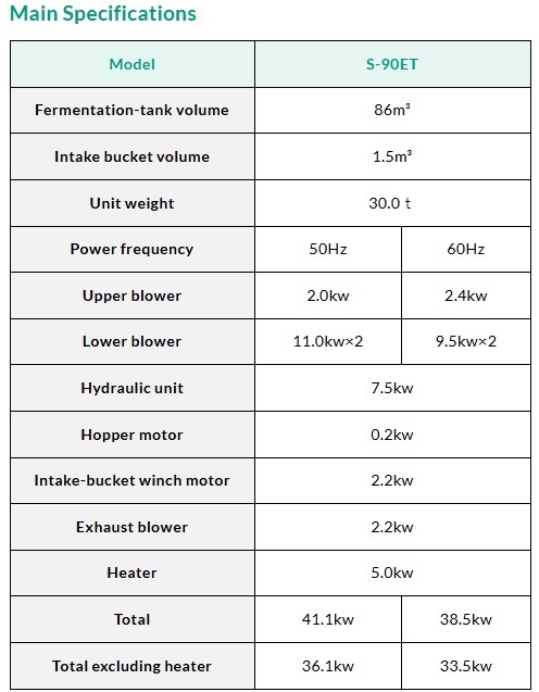 S90ET+ 發酵桶採用先進技術設計,日處理量最高可達 12 噸生雞糞,適用於 80,000 至 120,000 隻蛋雞規模的養殖場。自投料起算,僅需 10天即可完成發酵,產出高品質有機肥,無需額外排放廢水,有效降低環境負擔與法規風險。